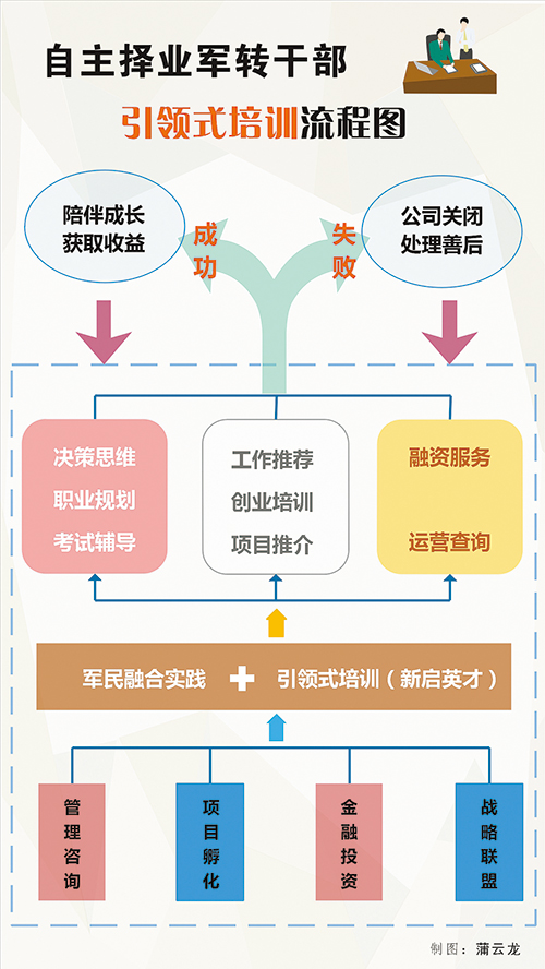 軍民融合作為國家戰(zhàn)略,意味著許多就業(yè)創(chuàng)業(yè)機會。國防和軍隊改革期間,干部轉(zhuǎn)業(yè)自主擇業(yè)條件進一步放寬。三百六十行創(chuàng)業(yè)天地寬,創(chuàng)業(yè)即便與軍民融合“不沾邊”照樣也能有建樹。但如果想在軍民融合領(lǐng)域有一番作為,就不得不考慮:能不能提供核心技術(shù)?如何實現(xiàn)“可持續(xù)貢獻”?引領(lǐng)式培訓(xùn)特別強調(diào)對創(chuàng)業(yè)的“立魂”教育:堅持國家和軍隊利益至上。從這里完成“充電”走出去的轉(zhuǎn)業(yè)復(fù)退戰(zhàn)友們說,這就像別開生面的“役前教育”,在創(chuàng)業(yè)前“打尖”墊底,確保今后不走彎路,不迷失方向。