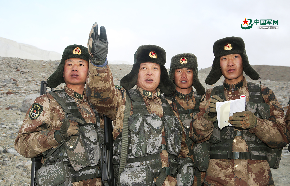 老戰(zhàn)士汶曉龍向新戰(zhàn)士介紹巡邏路上的注意事項(xiàng)。