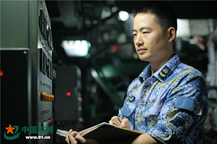 12月1日,中國海軍和平方舟醫(yī)院船輔機班長周靜在機艙記錄設(shè)備運行數(shù)據(jù)。