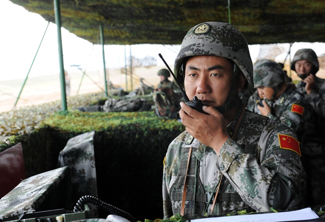 滿廣志在“和平使命-2014”聯(lián)合反恐軍事演習(xí)實(shí)兵指揮所現(xiàn)場(chǎng)指揮 新華社發(fā) 朱民 攝