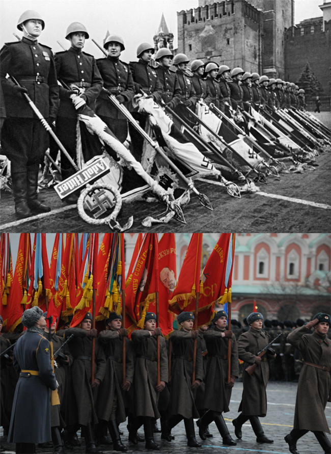 這張拼版照片上圖為1945年6月24日,蘇聯(lián)士兵在莫斯科紅場參加勝利閱兵時將納粹旗幟指向地面(資料照片)。下圖為2013年11月7日,俄羅斯士兵手持蘇聯(lián)旗幟在莫斯科紅場參加復(fù)古閱兵(新華社記者戴天放攝)。