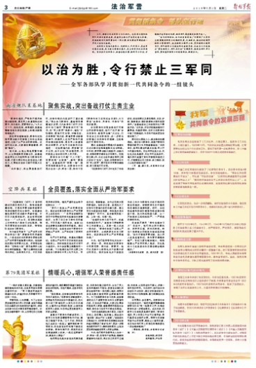 新舊對(duì)比振奮人心,練兵備戰(zhàn)熱潮涌動(dòng)。通過學(xué)習(xí)新條令,某國(guó)產(chǎn)新型掃雷艦四級(jí)軍士長(zhǎng)喬亮感慨地說:“共同條令,是軍隊(duì)建設(shè)的基本法規(guī)、軍人行為的基本準(zhǔn)則。無論將軍還是士兵,無論機(jī)關(guān)還是基層,無論平時(shí)還是戰(zhàn)時(shí),毫無例外地置于條令的管理和規(guī)范之中,才能鍛造出召之即來、來之能戰(zhàn)、戰(zhàn)之必勝的鋼鐵長(zhǎng)城!”?
