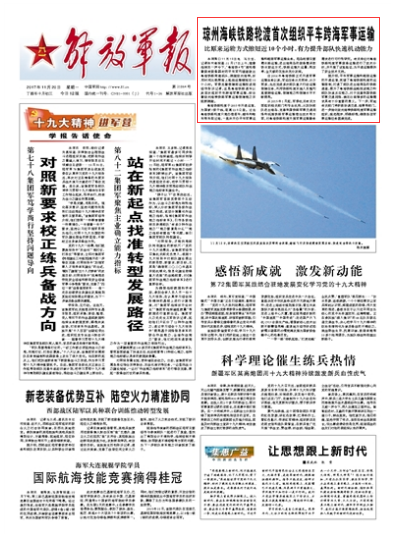 11月17日上午,隨著指揮員一聲令下,“粵海鐵4號”渡輪載著裝有裝備器材的平車軍列緩緩駛出粵海鐵路南港碼頭,跨越瓊州海峽,所用時間比換乘海上船舶運輸縮短近10個小時。軍委后勤保障部運輸投送局領(lǐng)導(dǎo)告訴記者,這是粵海鐵路通車以來首次組織平車跨海軍事運輸,標(biāo)志著瓊州海峽鐵路軍事運輸保障能力實現(xiàn)新跨越。請關(guān)注今日出版的《解放軍報》的詳細報道——