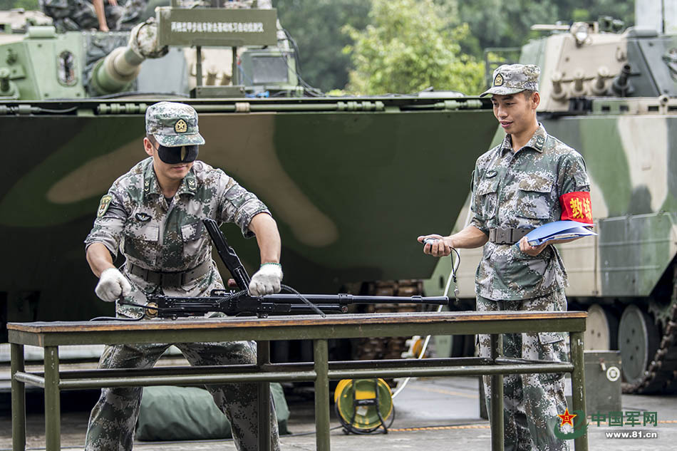 王銳(左)進(jìn)行高射機(jī)槍分解結(jié)合盲操作。王銳對戰(zhàn)車的每一個部件都爛熟于心,他的牛氣,來自滴水穿石的恒心,來自日復(fù)一日的苦練。于逢源 攝