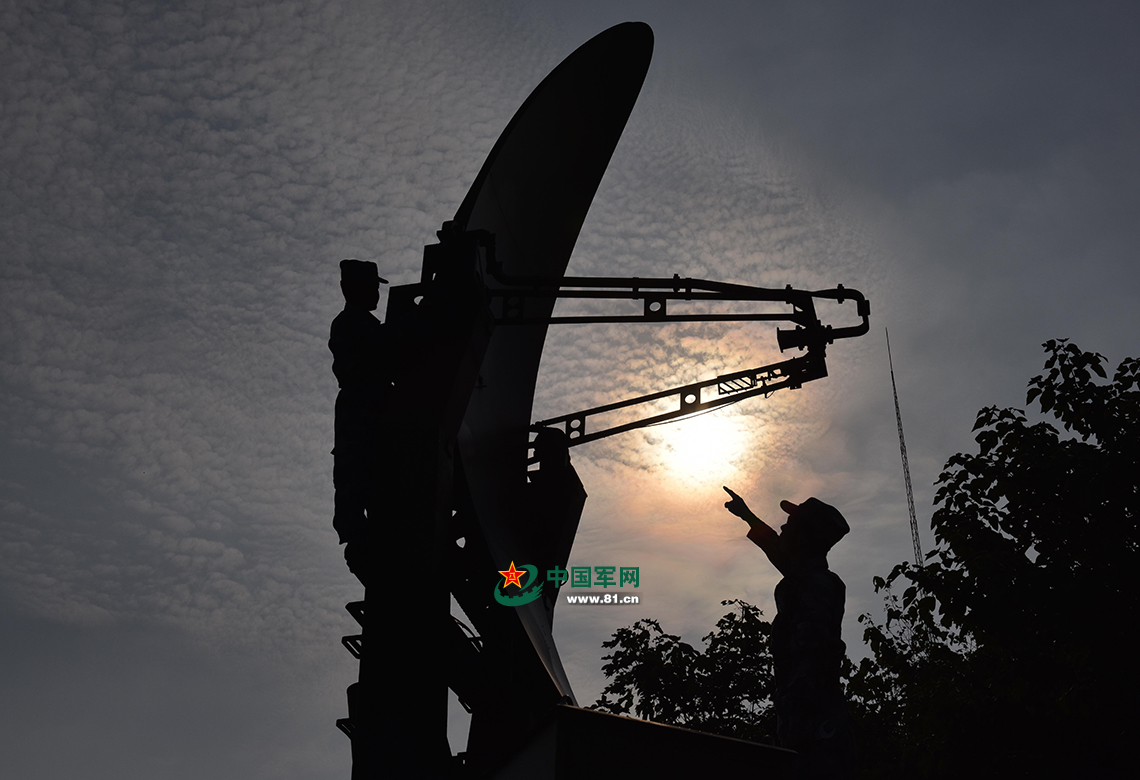 烈日當(dāng)頭,官兵一絲不茍,維修雷達(dá)天線。 高義文攝