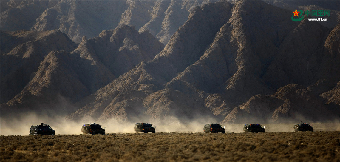 參加山地剿恐戰(zhàn)斗綜合演練的特戰(zhàn)隊(duì)員乘坐突擊車向目標(biāo)地域機(jī)動(dòng)。