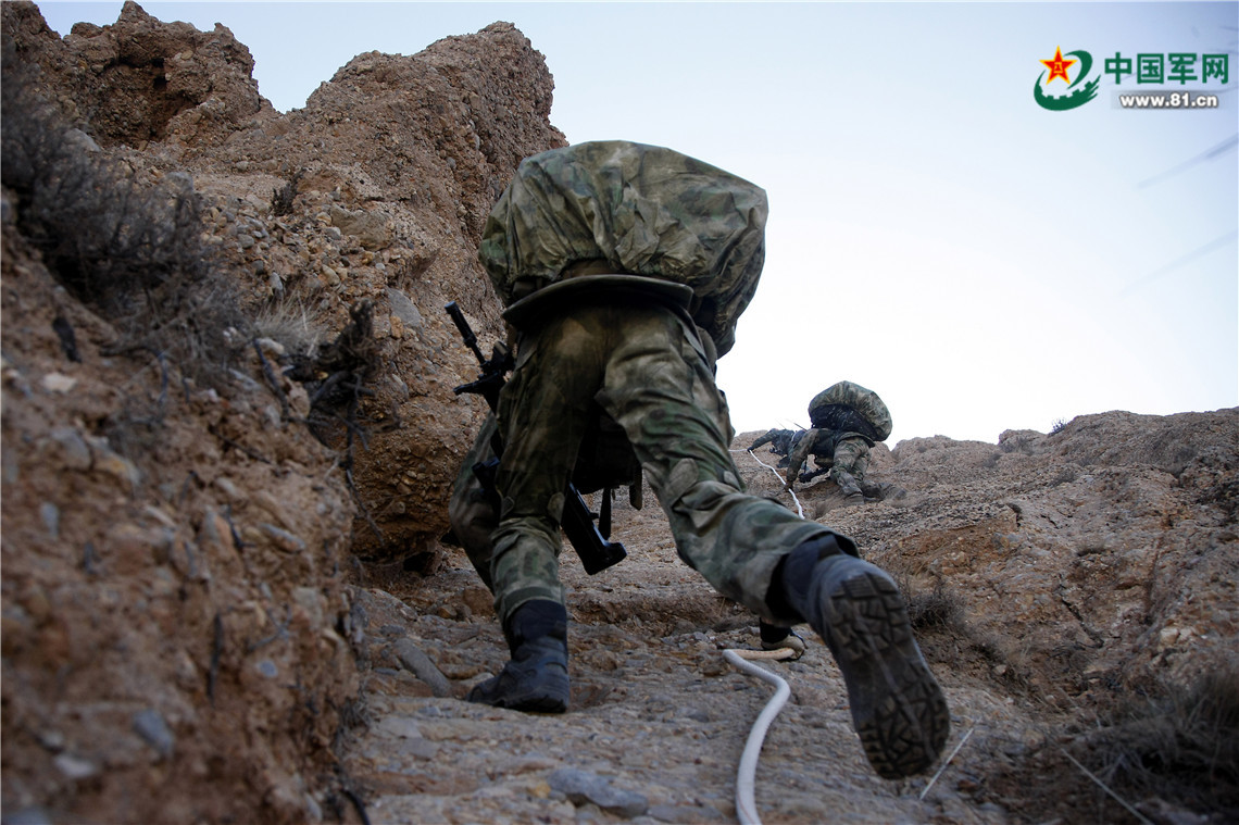 特戰(zhàn)隊員利用繩索沿山體攀登,圍殲“恐怖分子”。