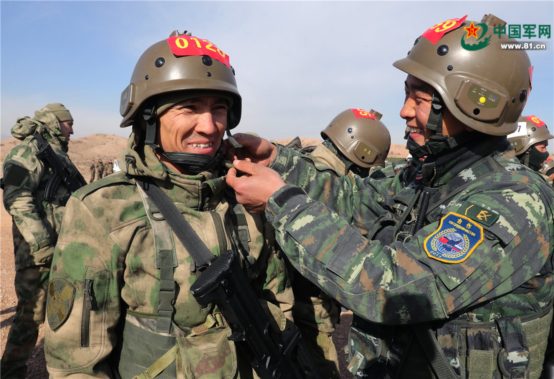 中俄雙方特戰(zhàn)隊(duì)員相互整理裝具。