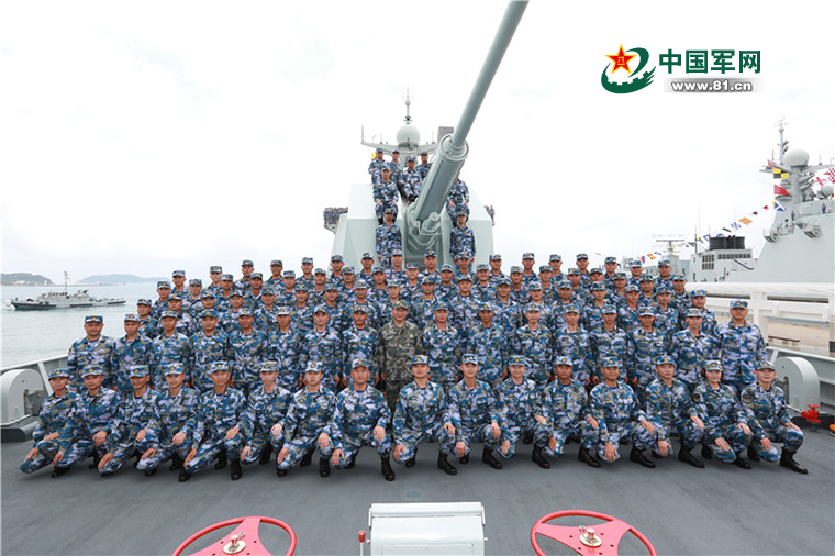 中央軍委在南海海域隆重舉行海上閱兵。中共中央總書記、國家主席、中央軍委主席習近平檢閱部隊并發(fā)表重要講話。這是習近平同長沙艦部分官兵合影。記者 周朝榮 攝