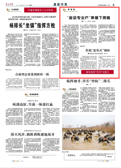 幾天后,旅機(jī)關(guān)出臺(tái)了新的調(diào)研規(guī)定,要求機(jī)關(guān)下基層調(diào)研時(shí)直接走進(jìn)班排房、走上訓(xùn)練場(chǎng),在與官兵落實(shí)“五同”中“抓活魚”。