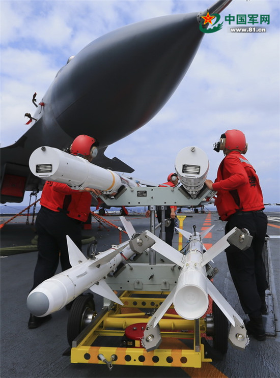 航空保障部門彈藥裝卸員轉(zhuǎn)運(yùn)導(dǎo)彈。記者 張雷 攝