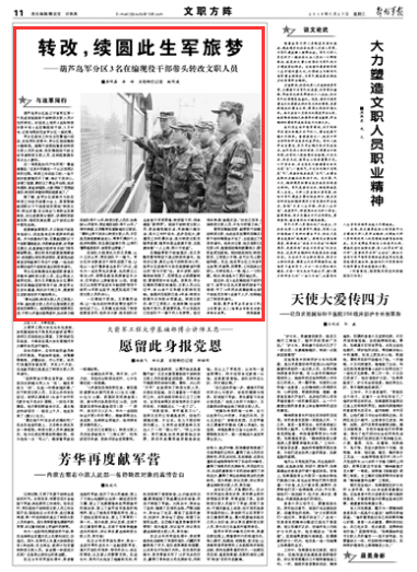 葫蘆島軍分區(qū)是遼寧省軍區(qū)第一個(gè)完成首批現(xiàn)役干部轉(zhuǎn)改文職人員計(jì)劃的單位。聽(tīng)說(shuō)在上報(bào)的8名擬轉(zhuǎn)改對(duì)象中有3名在編現(xiàn)役干部,5月中旬,記者專程前往該軍分區(qū)一探究竟。請(qǐng)關(guān)注今天出版的《解放軍報(bào)》的報(bào)道——
