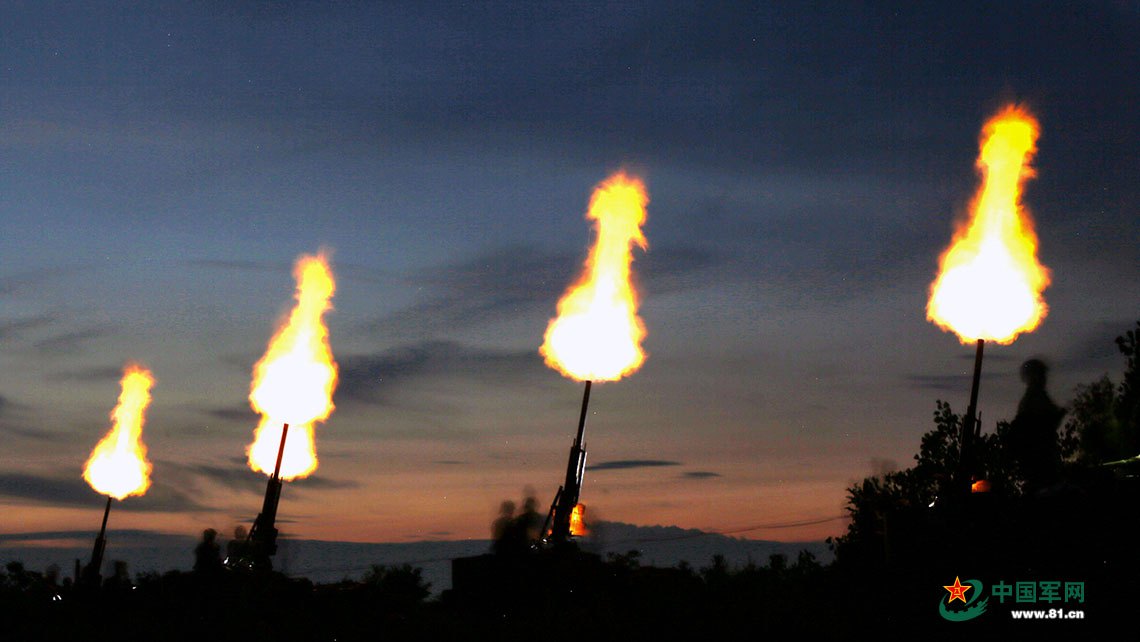 某新型速射炮夜間射擊。