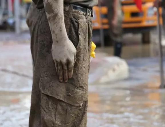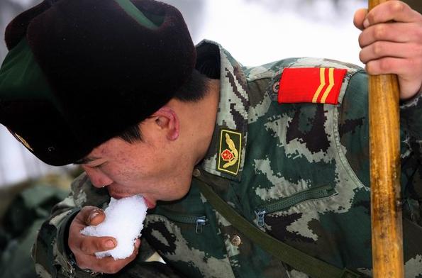 2008年2月3日,一名武警戰(zhàn)士在京珠高速公路破冰鏟雪間隙吃雪解渴。(來(lái)源:新華社)