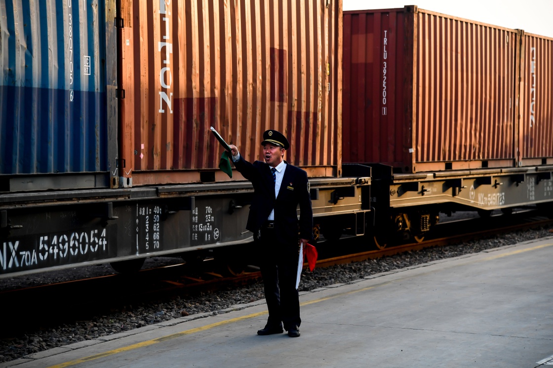 5月7日,在“中鐵聯(lián)集青島中心站”,值班站長(zhǎng)指令“青島號(hào)”中亞國(guó)際班列開(kāi)行。郭緒雷 攝