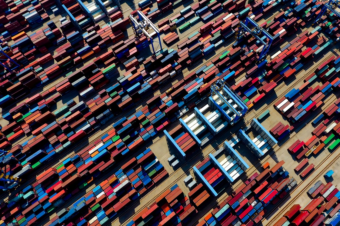 這是5月4日無人機拍攝的青島港前灣自動化集裝箱碼頭堆放的集裝箱。李紫恒 攝