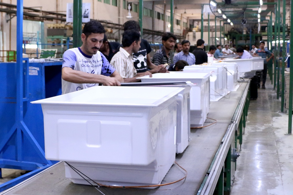 在海爾巴基斯坦魯巴經(jīng)濟區(qū)冰箱車間,工人在生產(chǎn)線上作業(yè)(資料照片)。