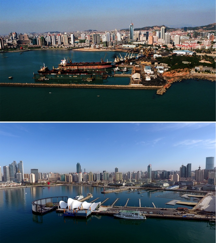 上圖:青島畫報攝影師張巖2000年拍攝的青島北海船廠(現(xiàn)奧帆中心)及周邊。新華社張巖 攝;下圖:4月16日無人機(jī)航拍的青島奧帆中心及周邊。新華社記者郭緒雷 攝(拼版照片)