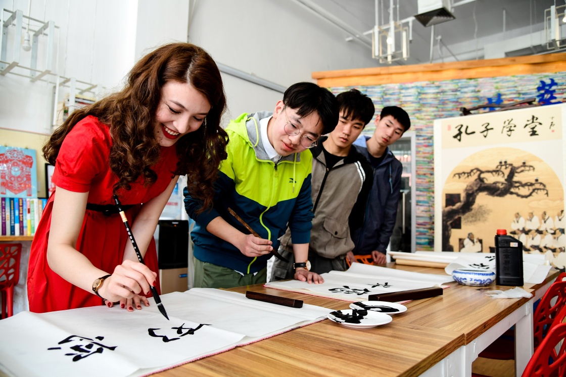 2018年5月3日,在中國石油大學(xué)(華東)大學(xué)生活動(dòng)中心,哈薩克斯坦留學(xué)生珍珠(左一)在翰墨飄香書畫社校友的指導(dǎo)下用毛筆在宣紙上書寫。新華社記者 郭緒雷 攝