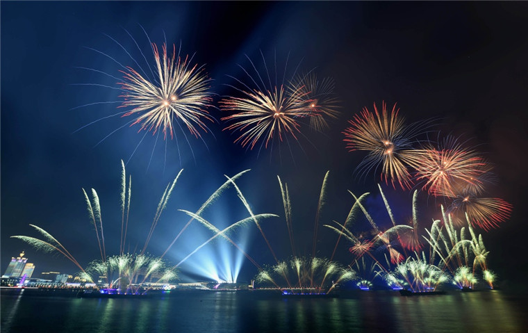 6月9日至10日,上海合作組織青島峰會在山東青島召開。這是9日晚在青島舉行的《有朋自遠方來》燈光焰火藝術(shù)表演。新華社記者 馬寧 攝
