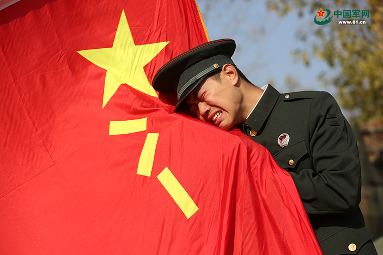 即將退伍的中士張興瑞深情依偎在軍旗旁(文中攝影圖片作者:姜帥、劉?。?。