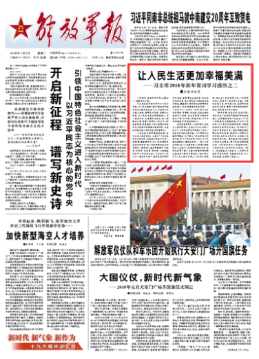 習(xí)主席發(fā)表的新年賀詞以人民為開篇、以人民為落腳,指出“要把老百姓的安危冷暖時刻放在心上,以造福人民為最大政績,想群眾之所想,急群眾之所急,讓人民生活更加幸福美滿”。這一重要論述,充滿情懷與擔(dān)當(dāng)、給人溫暖與力量,體現(xiàn)了堅持以人民為中心的發(fā)展思想,既是滿足人民日益增長的美好生活需要必須遵循的重要原則,也是抓好新年度工作的出發(fā)點和落腳點。請關(guān)注今日出版的《解放軍報》發(fā)表的評論員文章——