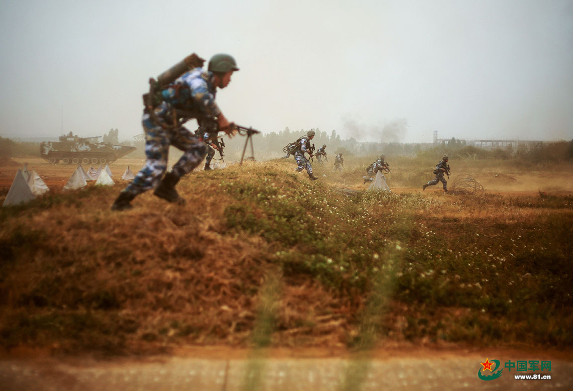 掃殘破障成功,向“敵”陣地前沿發(fā)起沖擊。