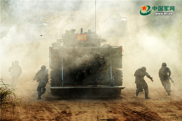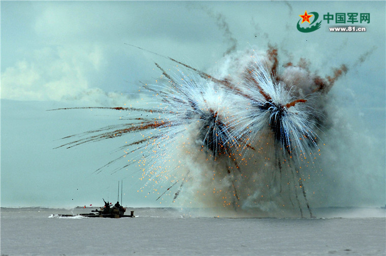 兩棲坦克分隊(duì)利用煙霧裝置向岸灘沖擊