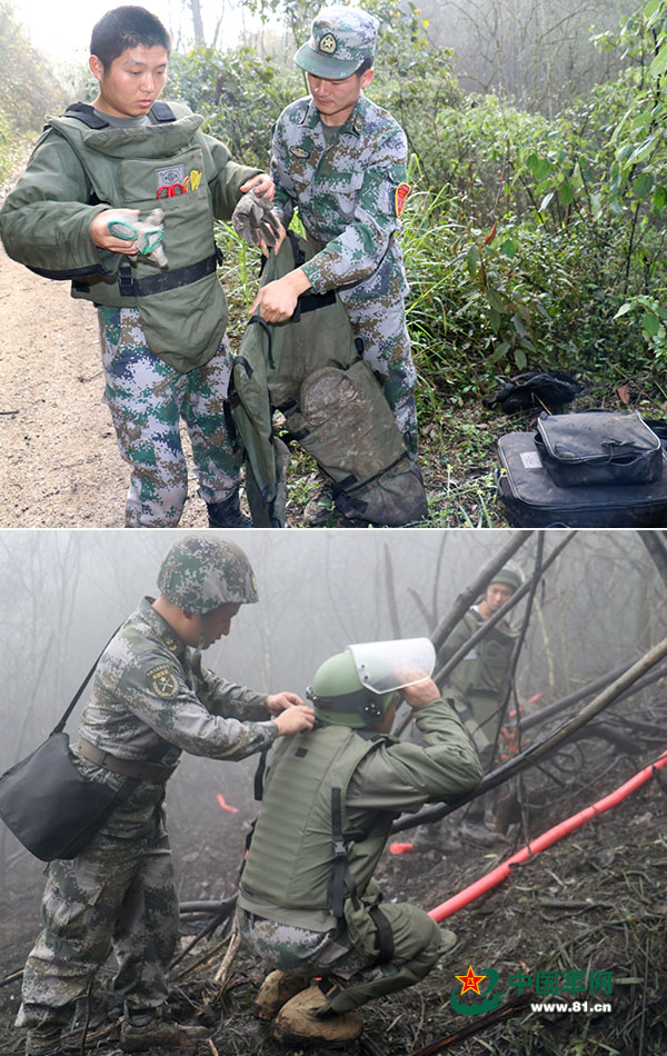 進(jìn)入雷區(qū)后,排雷隊員們穿戴好防護(hù)裝備,肩扛炸藥進(jìn)入雷場!