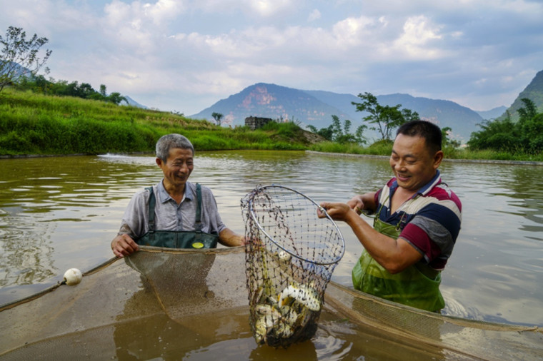 冷水魚(yú)養(yǎng)殖戶(hù)在魚(yú)塘里撈魚(yú)(2017年9月攝)。