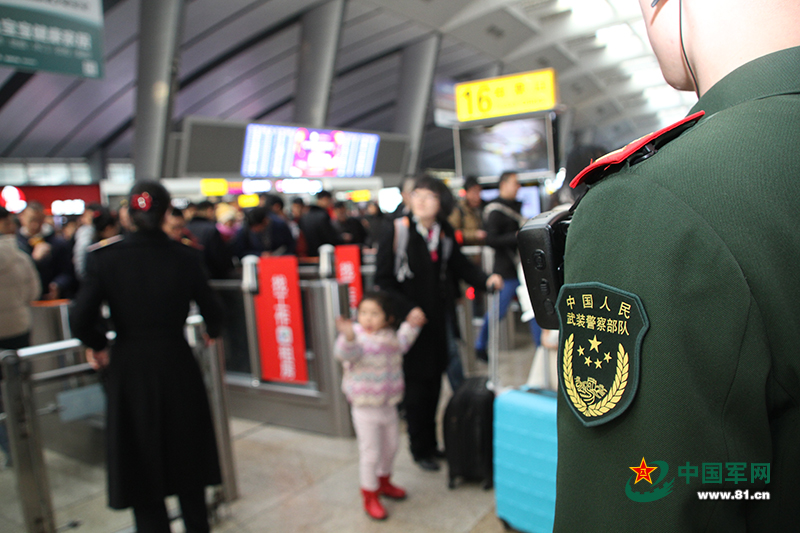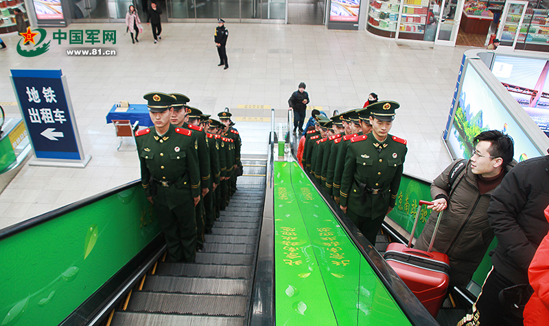 武警北京總隊(duì)執(zhí)勤第三支隊(duì)擔(dān)負(fù)此次北京南站春運(yùn)維穩(wěn)任務(wù)。 姜瀚攝