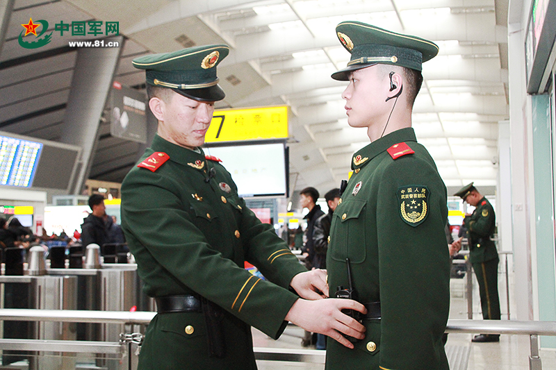 弓寧博(左)作為一名多次來過北京南站執(zhí)行春運維穩(wěn)任務的老同志,嚴格要求是他不變的宗旨。 姜瀚攝