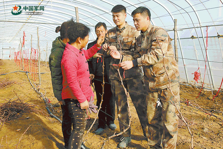遼寧省軍區(qū)駐村工作隊(duì)隊(duì)員為村民講解冷棚葡萄種植技術(shù)。肖建勇攝