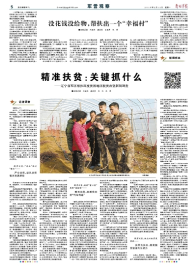 “車新村的扶貧成效只是我們加大幫扶脫貧攻堅(jiān)力度的一個(gè)縮影?!边|寧省軍區(qū)領(lǐng)導(dǎo)告訴記者:吹響扶貧集結(jié)號(hào),已是攻堅(jiān)拔寨時(shí)。為實(shí)現(xiàn)2020年全面建成小康社會(huì)的偉大目標(biāo),脫貧攻堅(jiān)業(yè)已成為當(dāng)前中國(guó)最重要的工作之一。近年來,遼寧省軍區(qū)在攻克堅(jiān)中之堅(jiān)、解決難中之難過程中感到,深度精準(zhǔn)扶貧,有3個(gè)關(guān)鍵點(diǎn)應(yīng)抓住。請(qǐng)關(guān)注今日《解放軍報(bào)》的報(bào)道——
