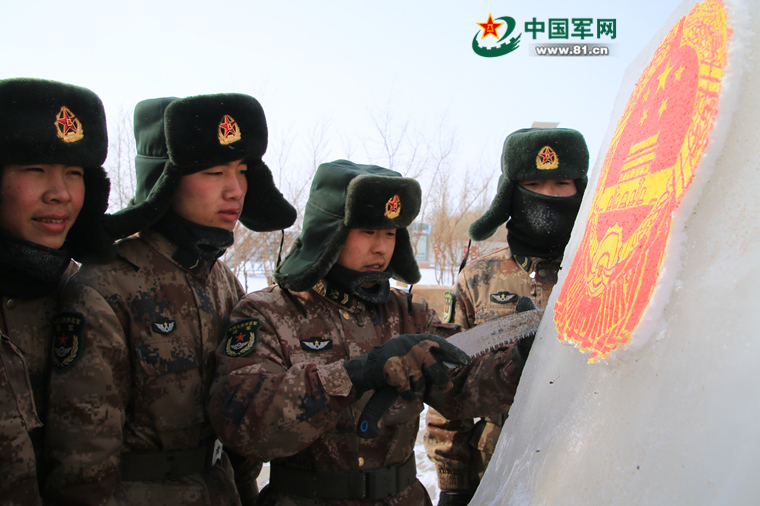 冰哨一旁,矗立著象征英勇頑強(qiáng)的“虎頭冰雕”,連隊(duì)“冰雕能手”張郭偉說:“要完成一件冰雕作品絕非易事,需要四五個(gè)人,利用業(yè)余時(shí)間精心雕琢一個(gè)星期才能完成。”
