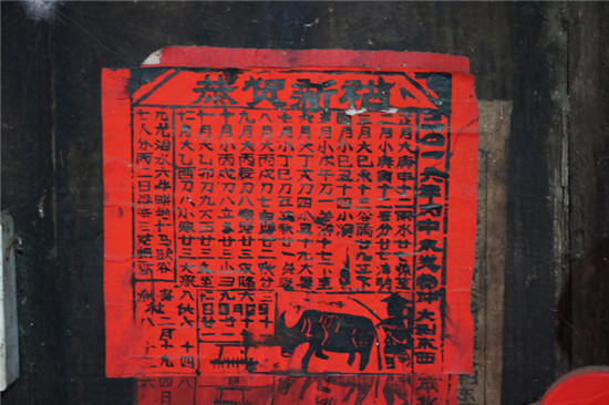 春官外出前要雕刻兩塊模子,一塊雕二十四節(jié)氣,一塊雕財(cái)神。模板刻好后刷上黑墨,再用紅紙印刷“春貼”。如今,在坡背村仍有許多人在自家屋內(nèi)貼上“春貼”。圖為“春貼”。