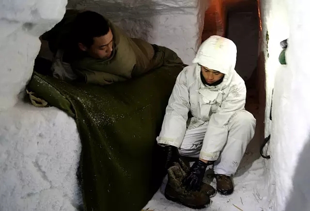 其實(shí),夜宿雪屋,可不是簡(jiǎn)單地睡個(gè)覺(jué),里面有不少講究。拿防寒靴擺放來(lái)說(shuō),經(jīng)過(guò)一天的行軍拉練,防寒靴的外層已經(jīng)被融雪浸濕,若是睡覺(jué)前不把靴子的表面撫平、捋直,等到第二天早晨起來(lái),靴子就會(huì)被凍得變了形,根本無(wú)法穿不進(jìn)去。王松記得,有一年部隊(duì)冬訓(xùn),自己就是因?yàn)樗皼](méi)有整理好靴子,第二天早晨不得不用小鐵鍬拍了好長(zhǎng)時(shí)間,才把靴子拍軟恢復(fù)形狀后穿上。