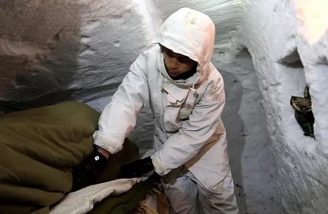 第一次睡雪屋的新戰(zhàn)士唐灃莘被安排和王松睡在一張床。這也是部隊的老傳統(tǒng):每張床上新兵老兵搭配,干部骨干睡在外側(cè),把最需要照顧的戰(zhàn)士放在自己身邊。唐灃莘睡覺有蹬被子的習慣,在連隊的時候,和班長鋪挨鋪。這一次,王排長特意和小唐睡在一張床,就是為了方便照看,“雪屋不像宿舍里有暖氣,他要是一不小心蹬掉被子沒人管,很容易被凍傷?!?/p>