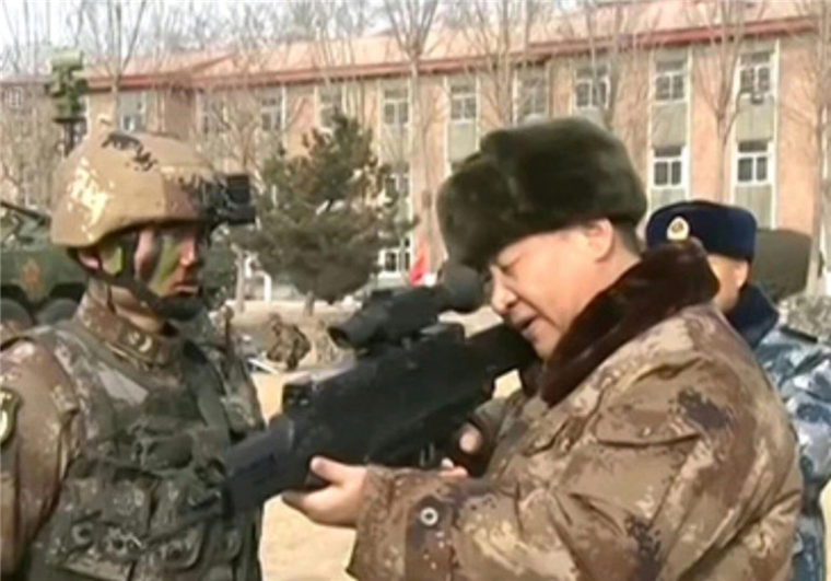 2018年1月3日,習(xí)主席再次來(lái)到中部戰(zhàn)區(qū),視察陸軍某師。在“英雄偵察連”,習(xí)主席從偵察兵手中接過(guò)一支自動(dòng)步槍?zhuān)似饦寔?lái)瞄準(zhǔn)。