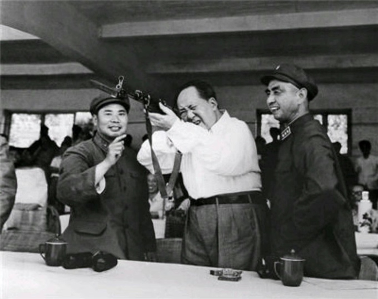 歷史,總有一些瞬間驚人巧合。北京,中國(guó)人民革命軍事博物館,陳列著一支56式半自動(dòng)步槍。櫥窗上方,是一張著名的照片:毛澤東主席閉起左眼,睜大右眼,舉起這支步槍瞄準(zhǔn),身旁的楊得志和楊勇將軍笑逐顏開(kāi)……
