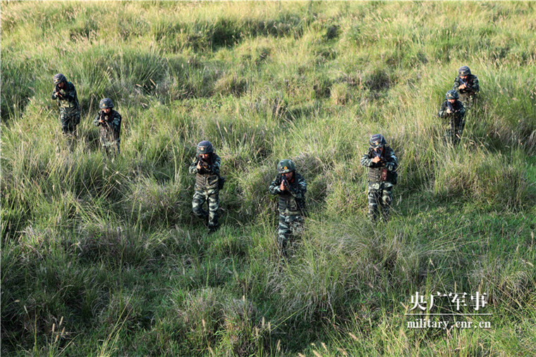 特戰(zhàn)隊(duì)員在草叢中成“前三角”隊(duì)形搜索前進(jìn)。雷轍攝