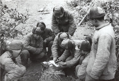 在漢江南灘頭阻擊戰(zhàn)前,某部七連戰(zhàn)士在寫決心書。