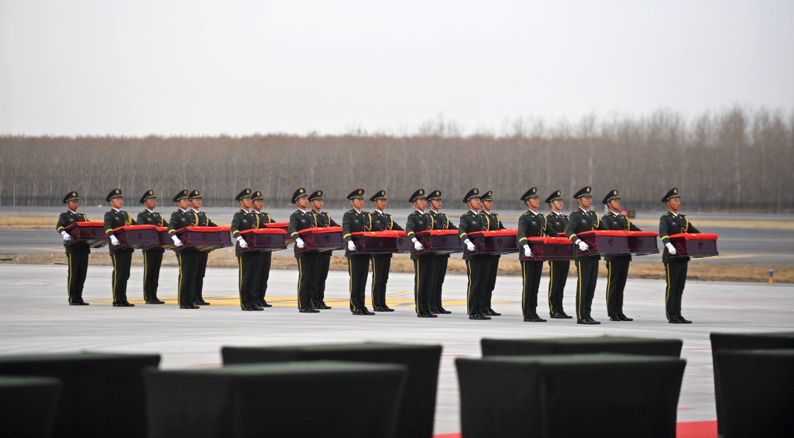 當(dāng)日,第五批在韓中國(guó)人民志愿軍烈士遺骸由我空軍專(zhuān)機(jī)護(hù)送從韓國(guó)接回遼寧沈陽(yáng),20位志愿軍烈士英靈回到祖國(guó)和人民懷抱。新華社發(fā) 龍雷 攝