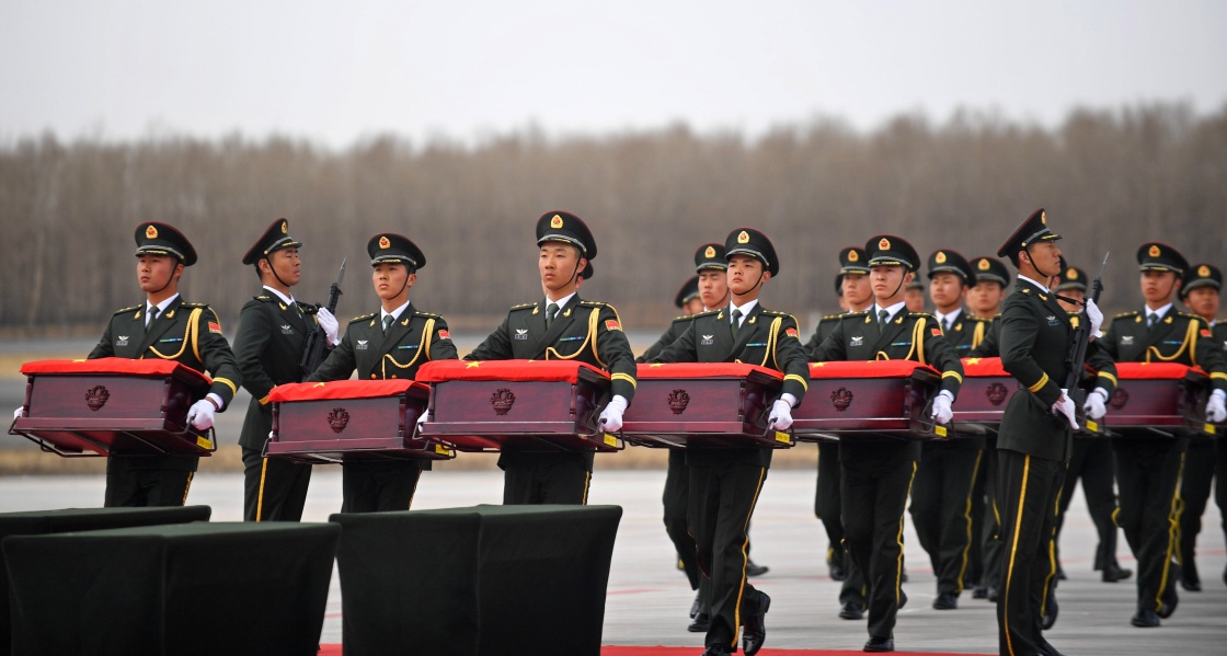 當日,第五批在韓中國人民志愿軍烈士遺骸由我空軍專機護送從韓國接回遼寧沈陽,20位志愿軍烈士英靈回到祖國和人民懷抱。新華社發(fā) 龍雷 攝