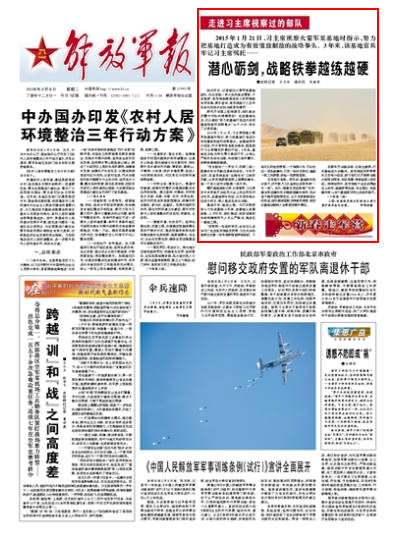 2015年1月21日,習(xí)主席視察火箭軍某基地時指示,努力把基地打造成為有效懾敵制敵的戰(zhàn)略拳頭。該基地領(lǐng)導(dǎo)介紹說,時不我待投身練兵備戰(zhàn),就是踐行習(xí)主席囑托的最好行動。3年來,基地官兵枕戈待旦聚力備戰(zhàn)打仗,從難從嚴(yán)組織實戰(zhàn)化訓(xùn)練,作戰(zhàn)能力連年攀升,戰(zhàn)略鐵拳越練越硬。請關(guān)注今日《解放軍報》的報道——