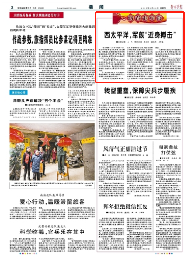 “戰(zhàn)斗警報(bào)!”2月中下旬的一天,西太平洋某海域海風(fēng)呼嘯,浪花翻騰。南海艦隊(duì)遠(yuǎn)海訓(xùn)練編隊(duì)向目標(biāo)海域高速機(jī)動(dòng),突然遭遇“敵”軍艦。隨即一場(chǎng)帶戰(zhàn)術(shù)背景的近距反擊演練打響,編隊(duì)長沙艦率先登場(chǎng)。請(qǐng)關(guān)注今日《解放軍報(bào)》的報(bào)道——