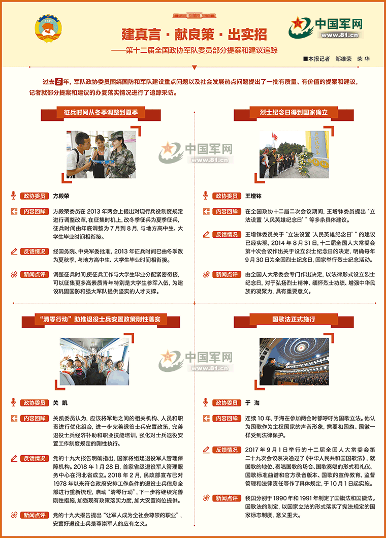 過去5年,軍隊(duì)政協(xié)委員圍繞國防和軍隊(duì)建設(shè)重點(diǎn)問題提出了一批有質(zhì)量、有價(jià)值的提案和建議,這些提案和建議的辦復(fù)落實(shí)情況如何?軍報(bào)記者就此進(jìn)行了追蹤采訪。請關(guān)注今日出版的《解放軍報(bào)》帶來的詳細(xì)報(bào)道: