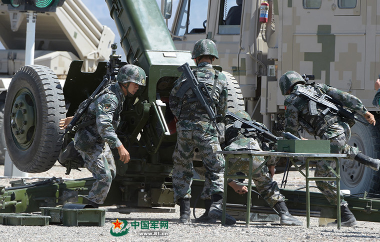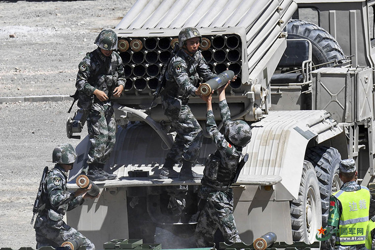 8月11日,“軍械能手”修理排接力賽中,中國參賽隊員協(xié)力裝填火箭炮空包彈。
