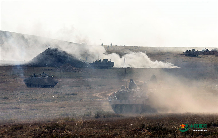 “跨越-2017·朱日和”基地化訓練。紅軍部隊在漫天煙幕的掩護下,向藍軍堅守的城市發(fā)起進攻。