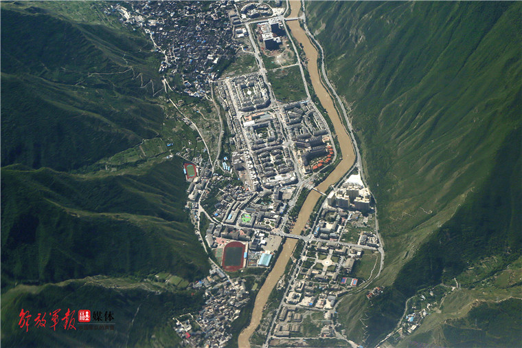 2017年8月10日15時(shí)許,西部戰(zhàn)區(qū)空軍航空兵某師一架運(yùn)-9飛機(jī)在九寨溝縣震區(qū)上空?qǐng)?zhí)行航空偵察任務(wù)后順利返航。震后的九寨溝溝內(nèi)城鎮(zhèn)航拍圖。